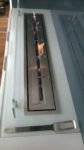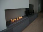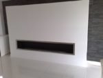 Biokominek wykonany według projektu. Zabudowa wbudowana we wnękę o wymiarach 1600 mm z palnikiem artflame 1000 mm. Całość wykończona ramką ze stali nierdzewnej, wkład biokominka wykonany z aluminium gr 5 mm. Palnik umieszczony w komorze bezpieczeństwa z regulacją manualną wielkości płomienia