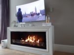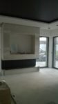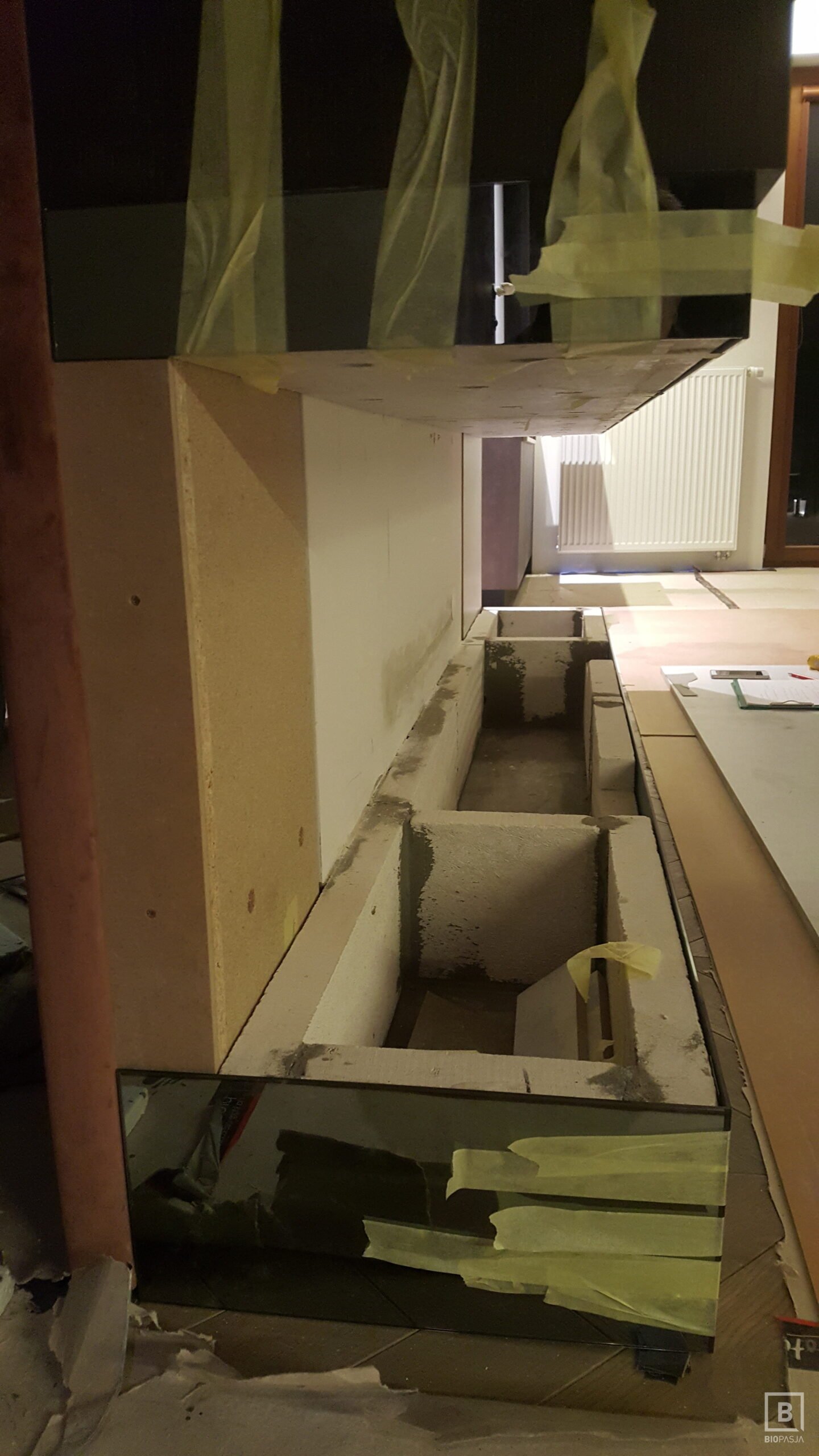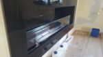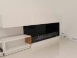 Zabudowa wykonana z płyty meblowej oraz szkła lacobel. Wkład artflame 1000 wraz ze szklanym ekranem ochronnym OPtiWithe 10 mm osadzony na uchwytach uniwersalnych. Całość została wykonana przy współpracy z projektantem oraz zespołem biopasja.