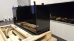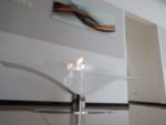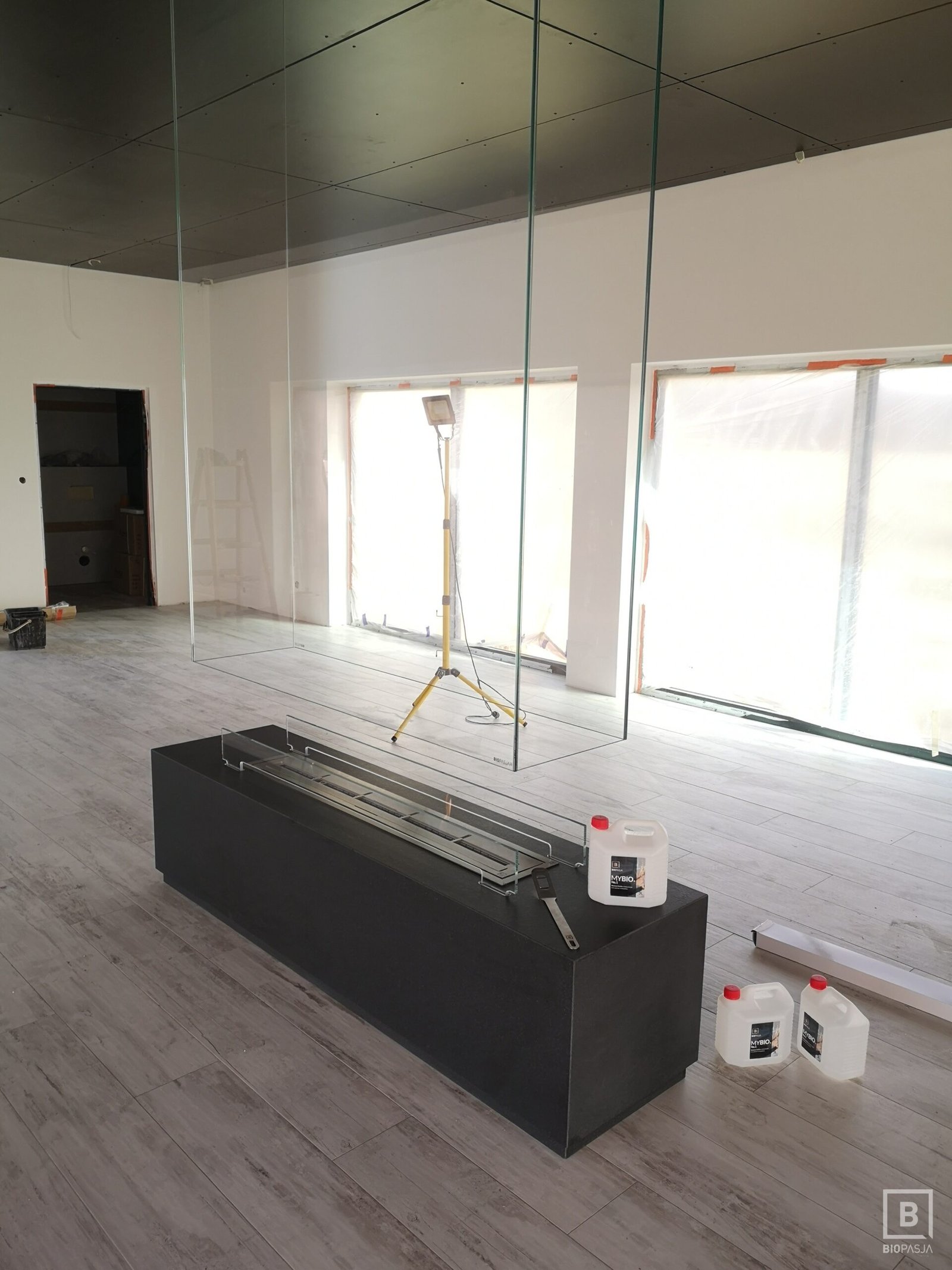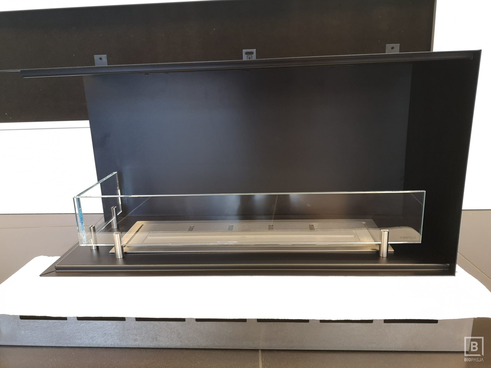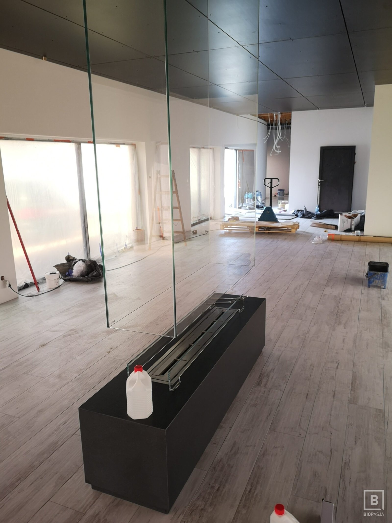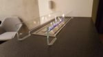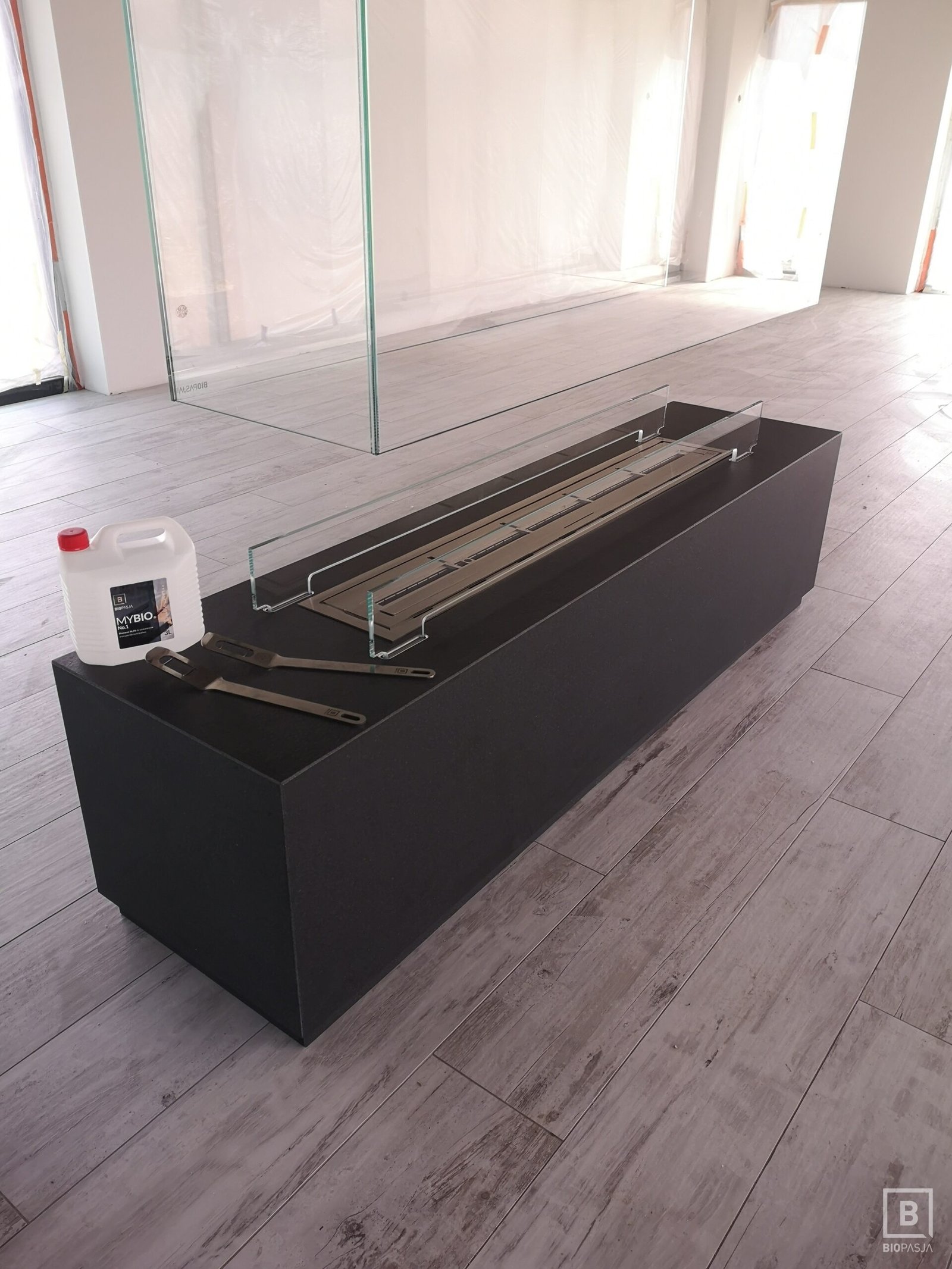 Indywidualny projekt, szklana konstrukcja 300kg wisząca z sufitu, podest pod konstrukcją szklaną, wykonany z granitu z opatentowanymi uchwytami concealed latches NEO PRO, palnik artflame 1200mm. Bardzo nietypowy i indywidualny projekt. Zapraszamy do współpracy. Zespół Biopasja -