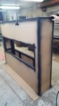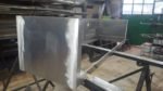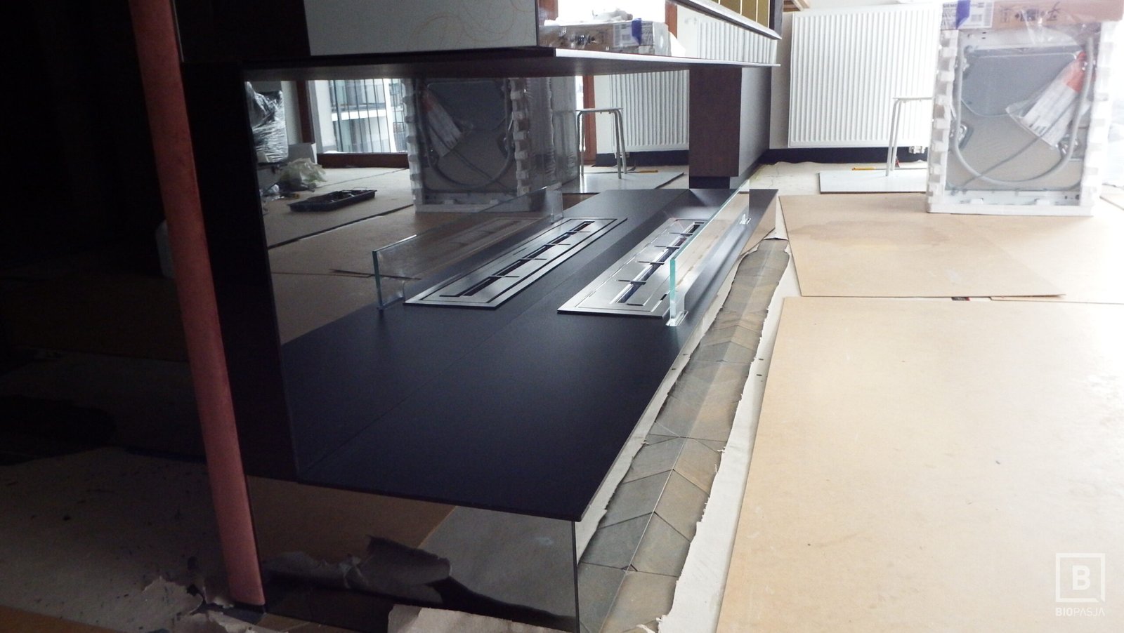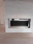 Zabudowa skrzyniowa zaprojektowany przez dział projektowy biopasja. Całość wykonana z aluminium gr 5 mm wraz z opuszczoną Top Płytą na dekorację paleniska - marmur biała Carrara. Palnik artflame 900 mm wraz z komorą bezpieczeństwa i manualną regulacją wysokości płomienia. Skrzynia kominkowa przed zabudowaniem.