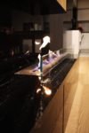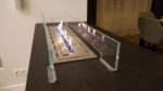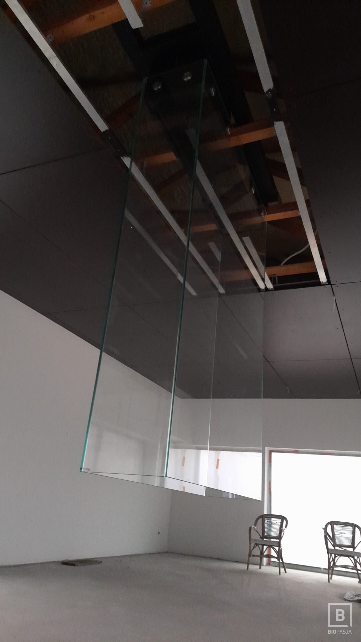 Stajnia dla konna, szklana konstrukcja o wadze 300 kg zwisająca z sufitu z granitowym podestem.