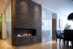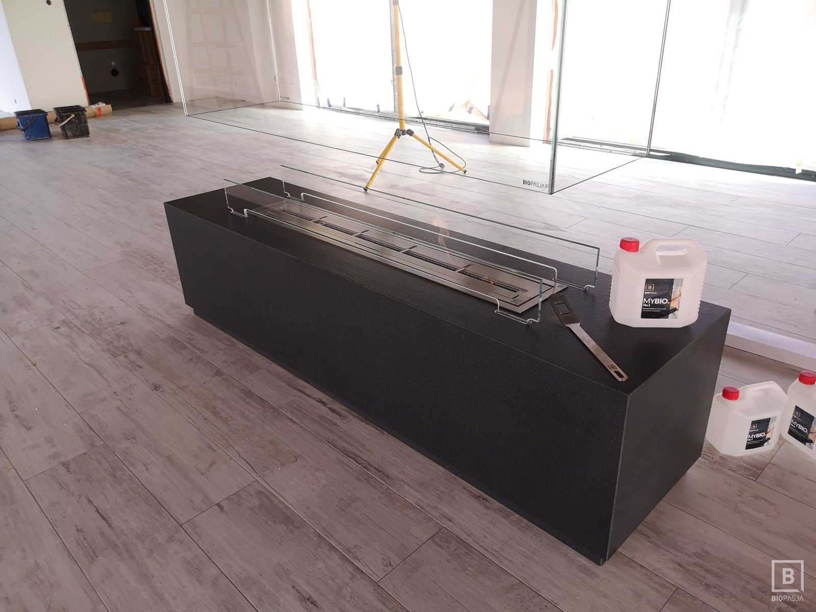 Biokominek według projektu wykonanego przez zespół projektowy biopasja. Wkład skrzyniowy wbudowany w ścianę wykonany z aluminium gr 5 mm oraz szybami OptiWithe gr 10 mm stabilizującymi płomień. Wkład obsługiwany z dwóch stron, za pomocą zawiasów stałych. Zabudowa obłożona kamieniem naturalnym Oriental Bazalt.