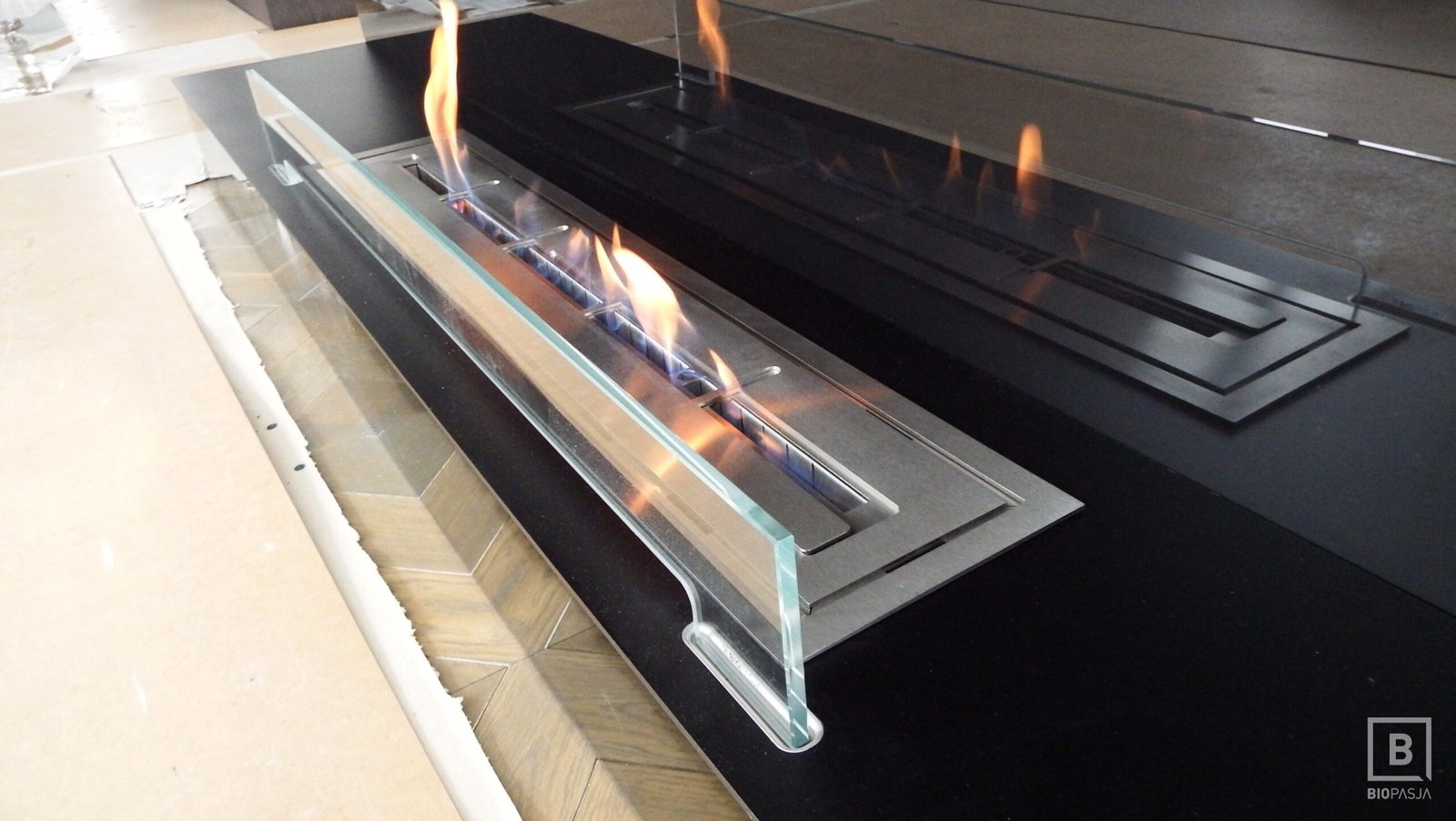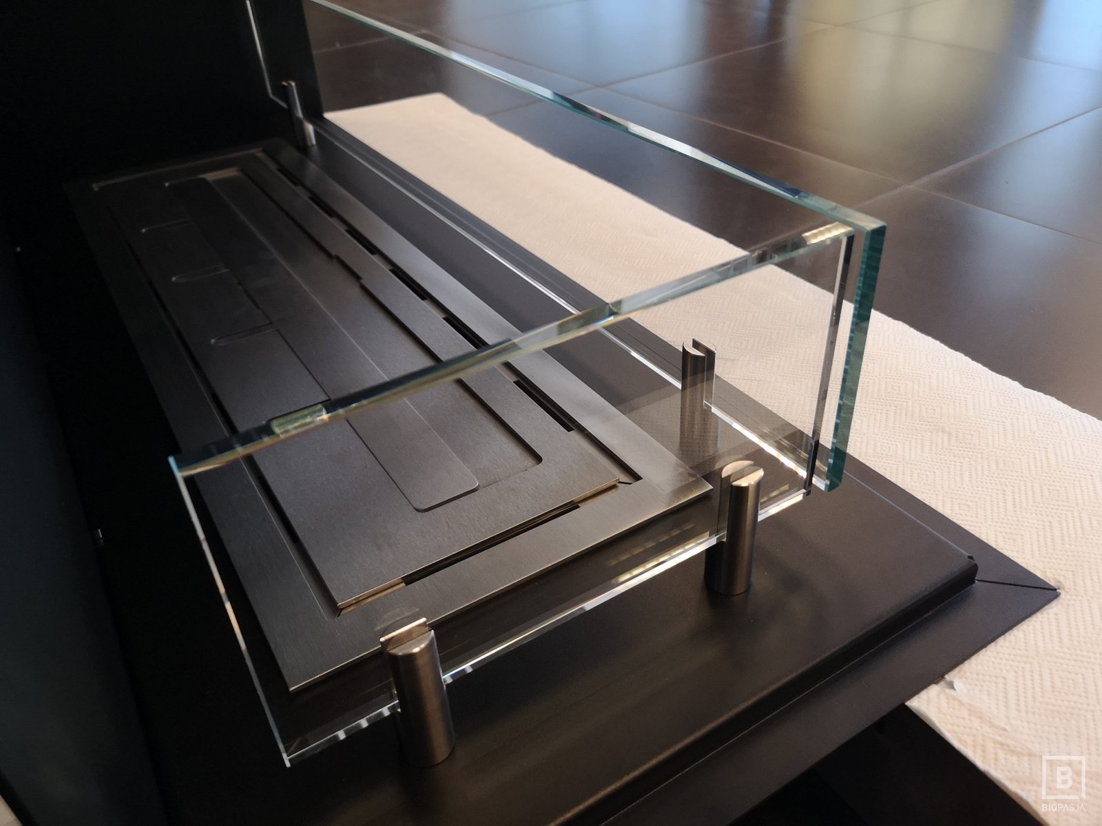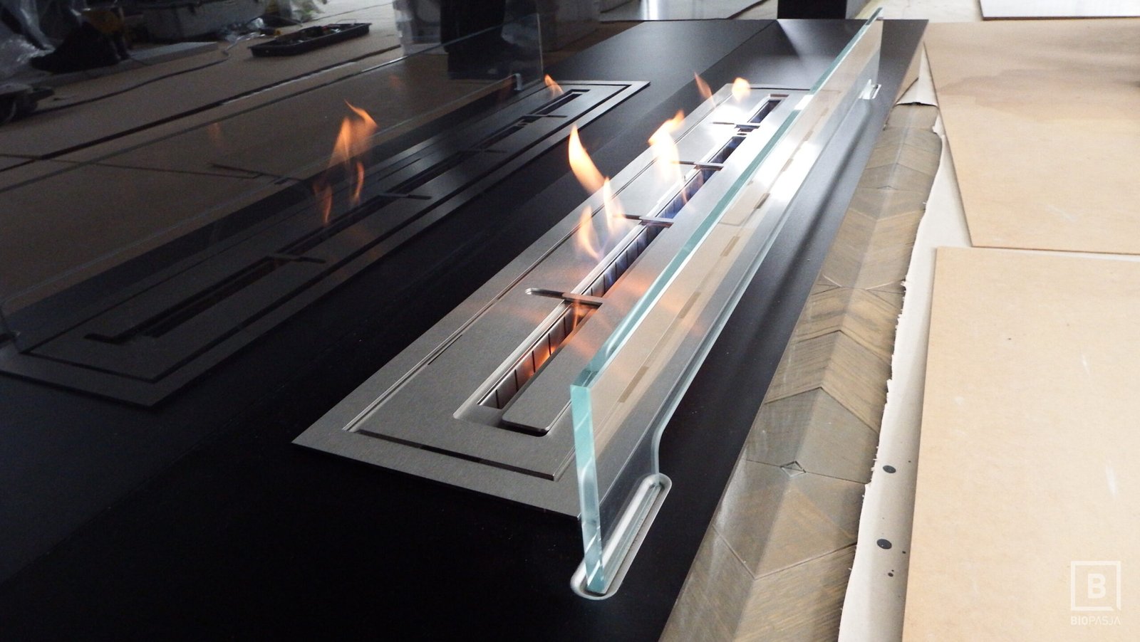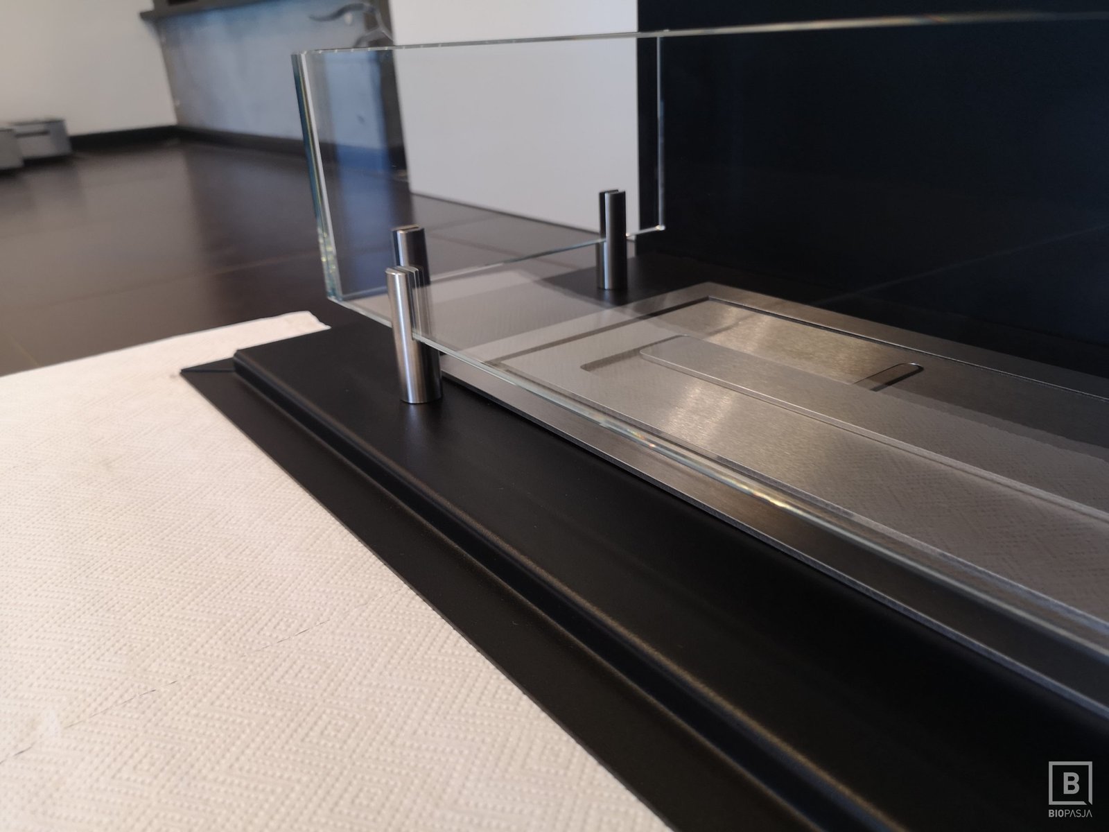Niestandardowy biokominek narożny zaprojektowany według indywidualnego projektu przez dział projektowy biopasja. Wkład kominka wykonany z aluminium, ramka wykończeniowa wraz z palnikiem biokominkowym artflame ze stali nierdzewnej. Palnik biokominkowy artflame z regulacją wysokości płomienia umieszczony w dolnej części komory.