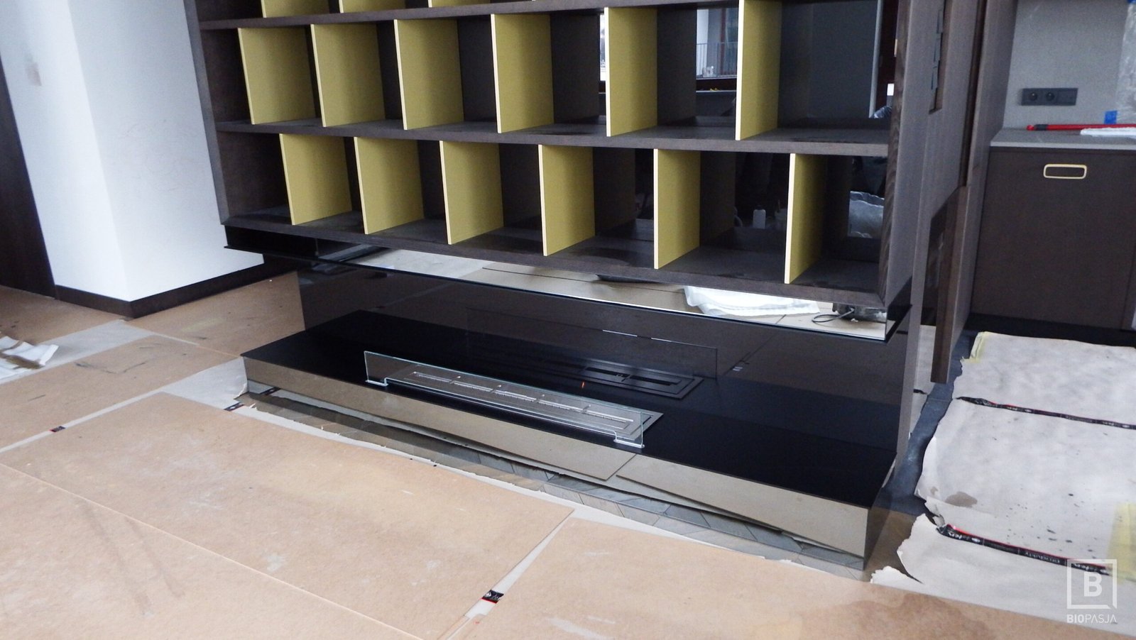 Zabudowa wykonana według projektu wykonanego przez zespół projektowy biopasja. Biokominek wykonany na indywidualne zamówienie wbudowany we wnękę z podwójnym paleniskiem