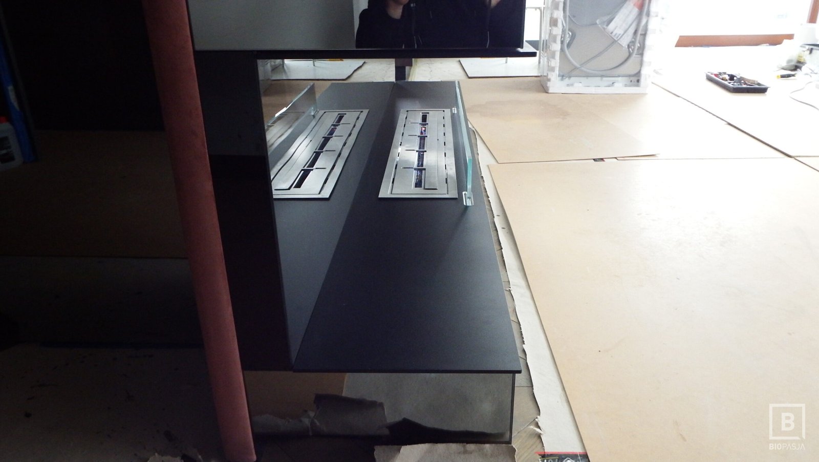 Nowo ukończona realizacji na wymiar. Biokominek, biopalenisko w elewacji meblowej z obiciami lustrzanymi, frontowa szyba ekranowa na opatentowanych uchwytach concealed latches NEO PRO. Biopalenisko Artflame 1000, w płytach aluminiowych 6mm. Wyszło rewelacyjnie, bardzo dziękujemy za projekt. Zespół Biopasja. -