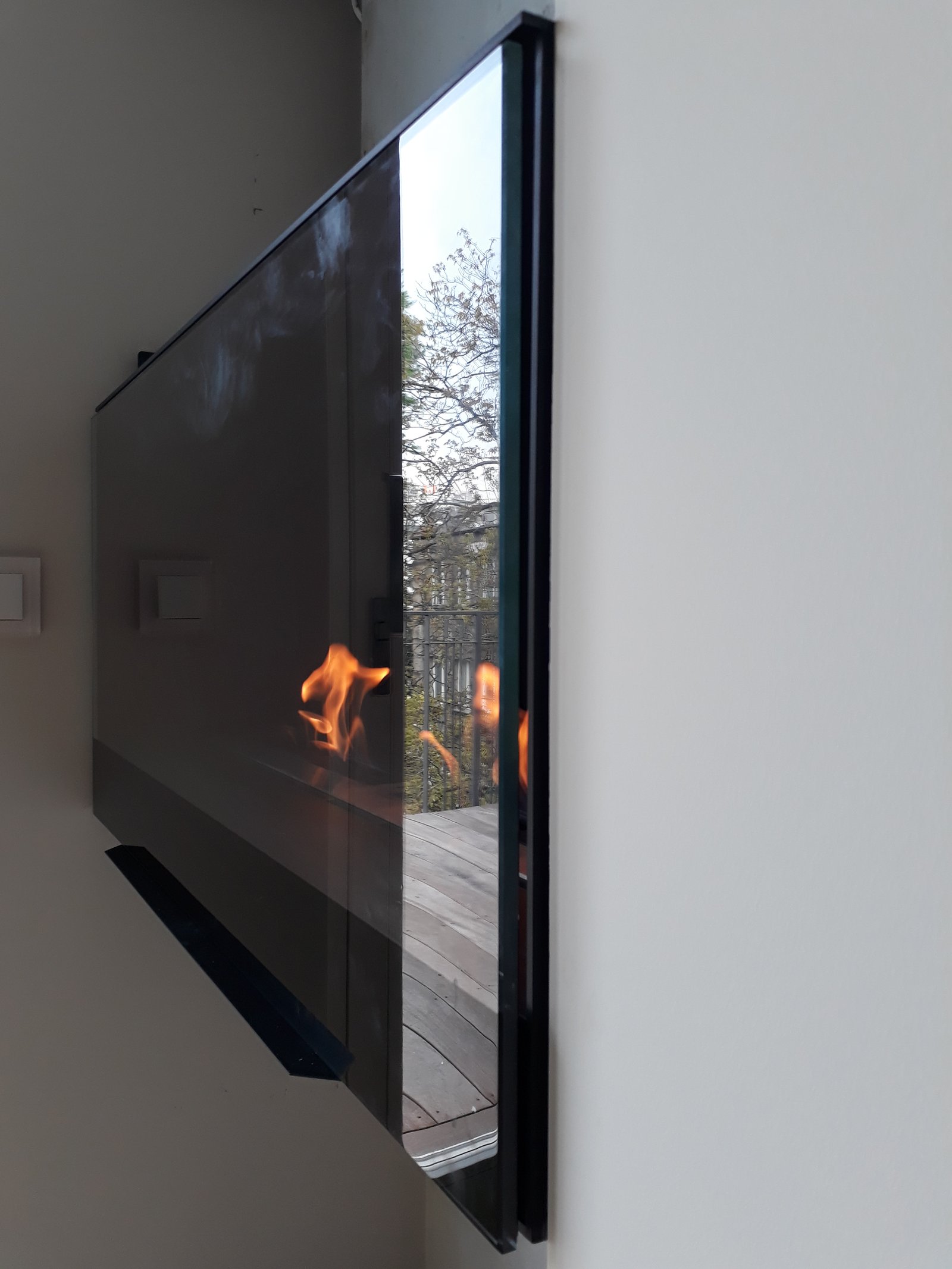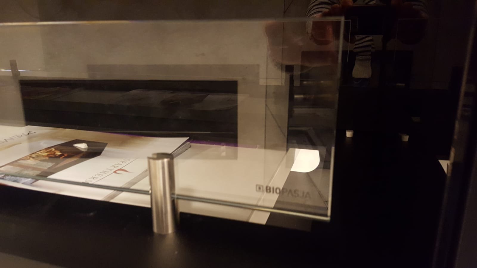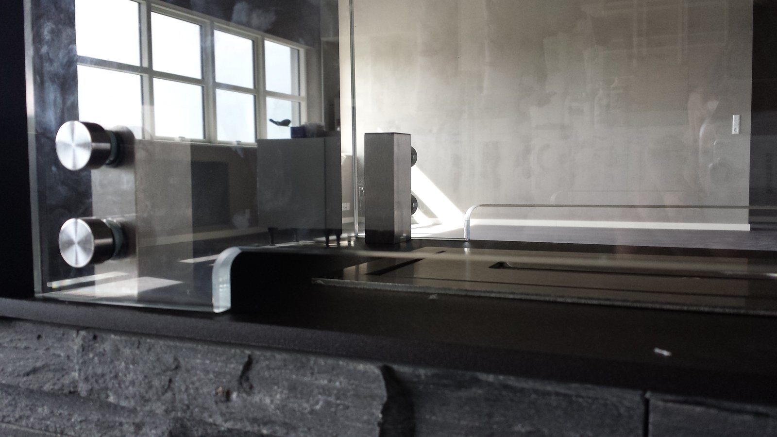 Nowo ukończona realizacji na wymiar. Biokominek, biopalenisko w elewacji meblowej z obiciami lustrzanymi, frontowa szyba ekranowa na opatentowanych uchwytach concealed latches NEO PRO. Biopalenisko Artflame 1000, w płytach aluminiowych 6mm. Wyszło rewelacyjnie, bardzo dziękujemy za projekt. Zespół Biopasja. -
