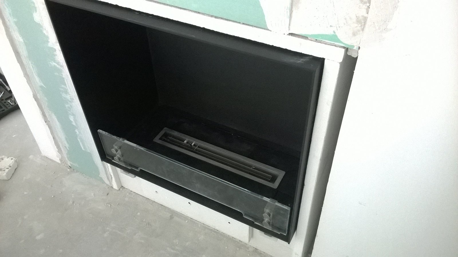 Biokominek wykonany według projektu. Zabudowa wbudowana we wnękę o wymiarach 1600 mm z palnikiem artflame 1000 mm. Całość wykończona ramką ze stali nierdzewnej, wkład biokominka wykonany z aluminium gr 5 mm. Palnik umieszczony w komorze bezpieczeństwa z regulacją manualną wielkości płomienia