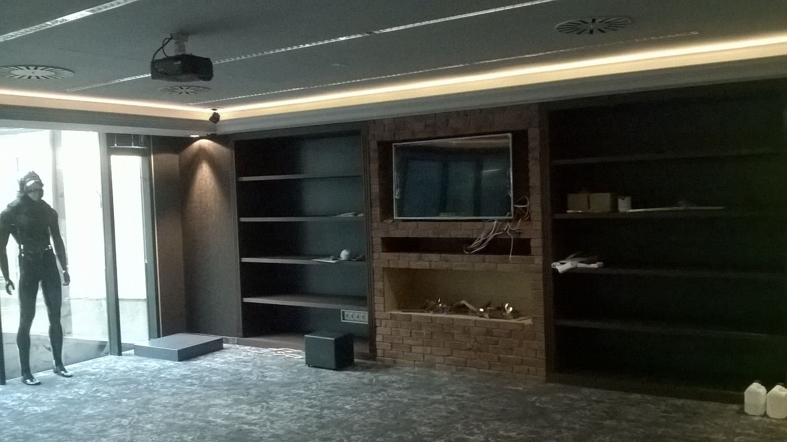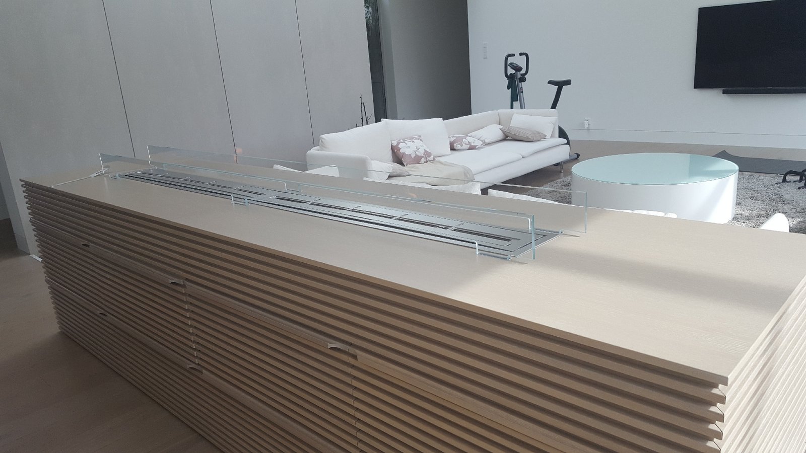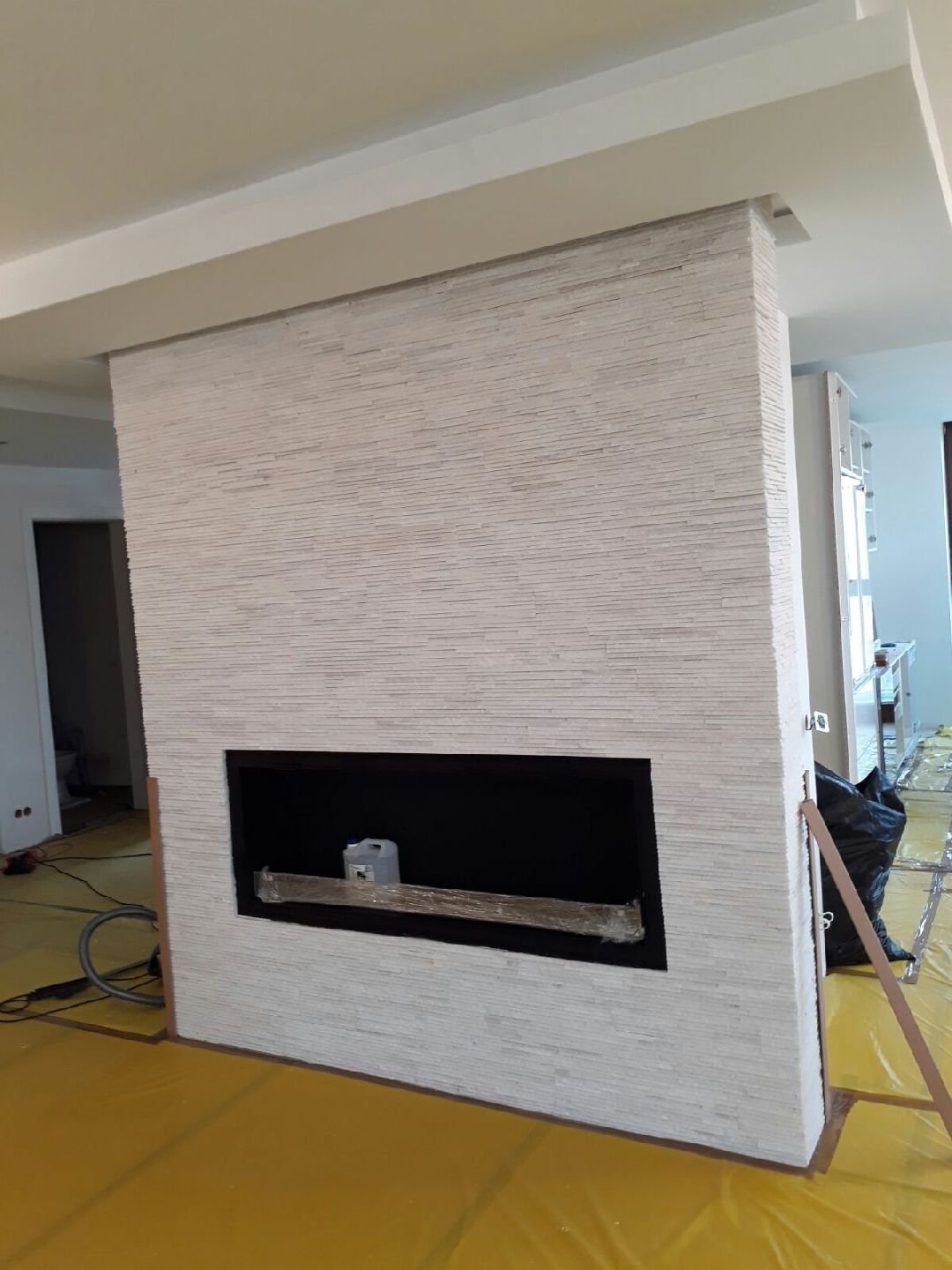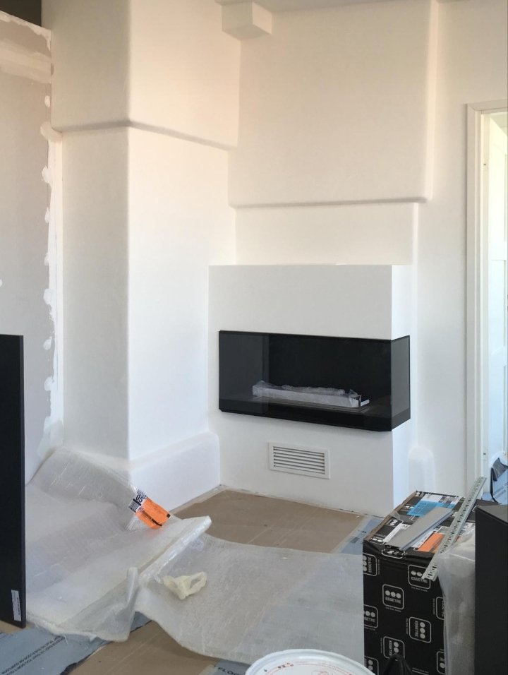 Zabudowa o szerokości 1300 mm składa się z wkładu biokominkowego wraz z palnikiem artflame 1000. Zewnętrzna część została wykonana z płyty izolacyjnej na którą ostatecznie został nałożony stiuk. Całość wraz ze szczegółowym projektem została wykonana przez zespół biopasja.