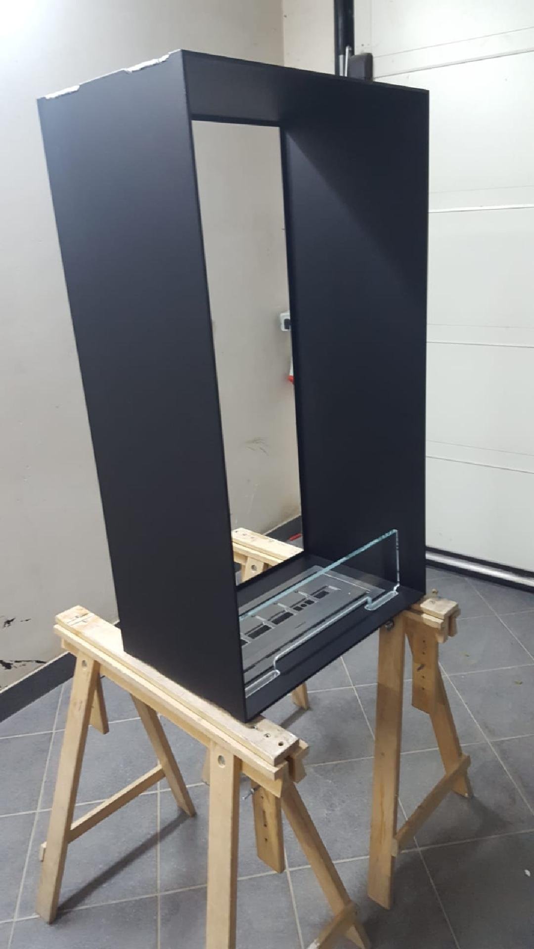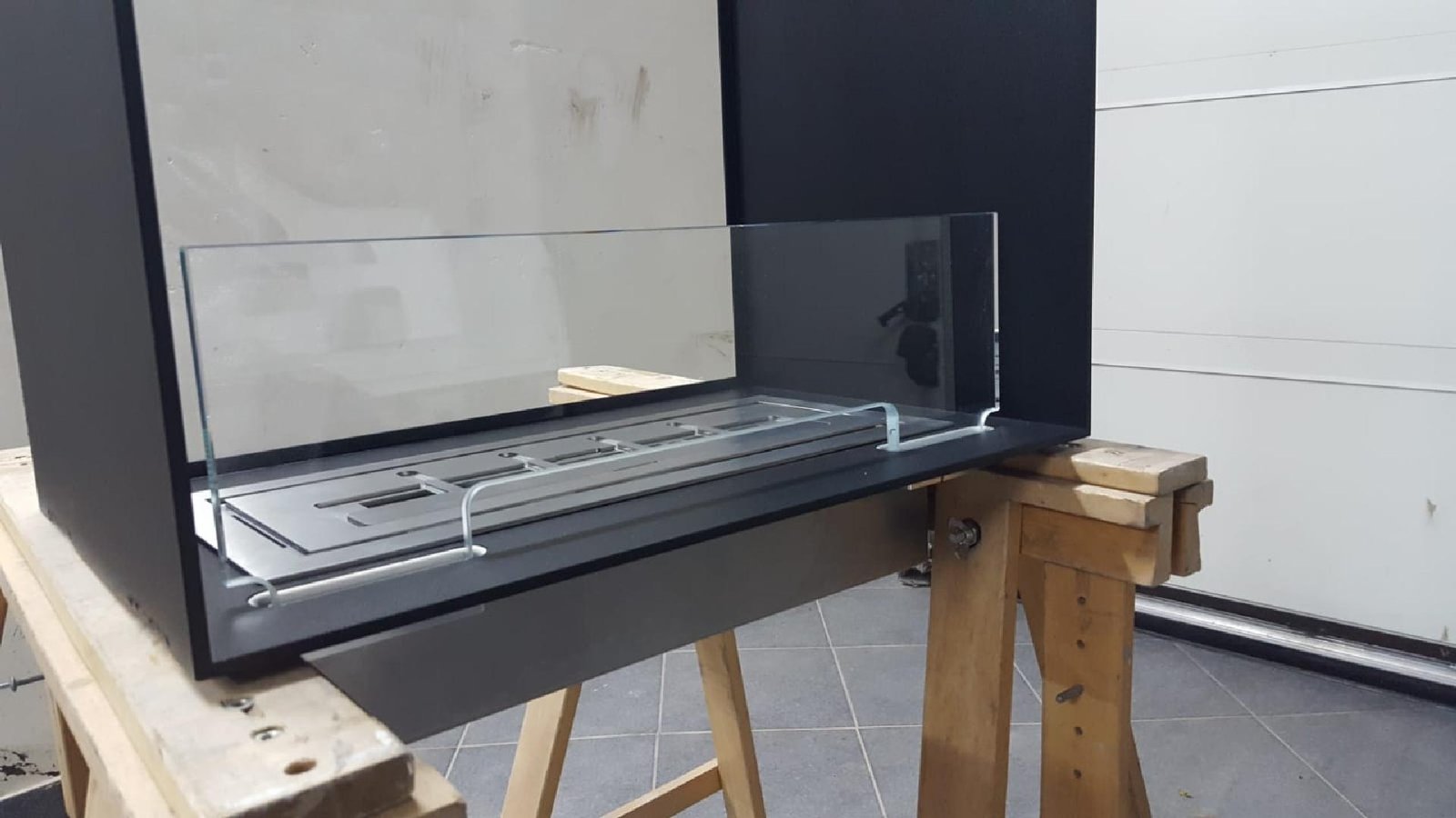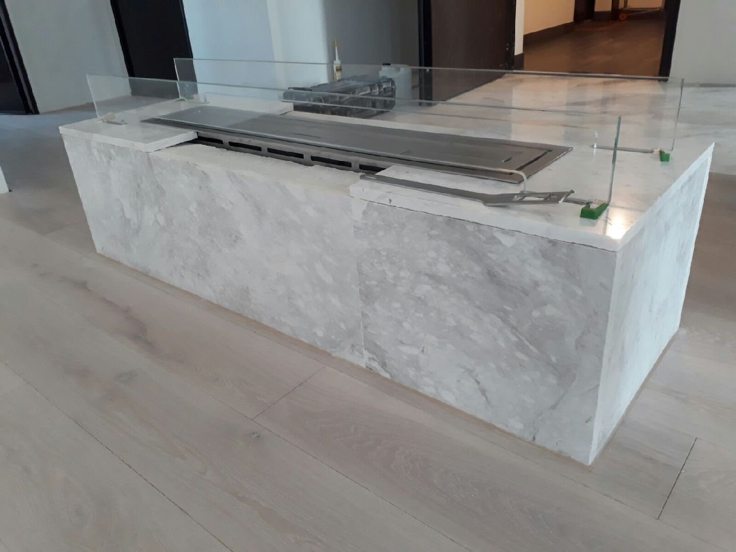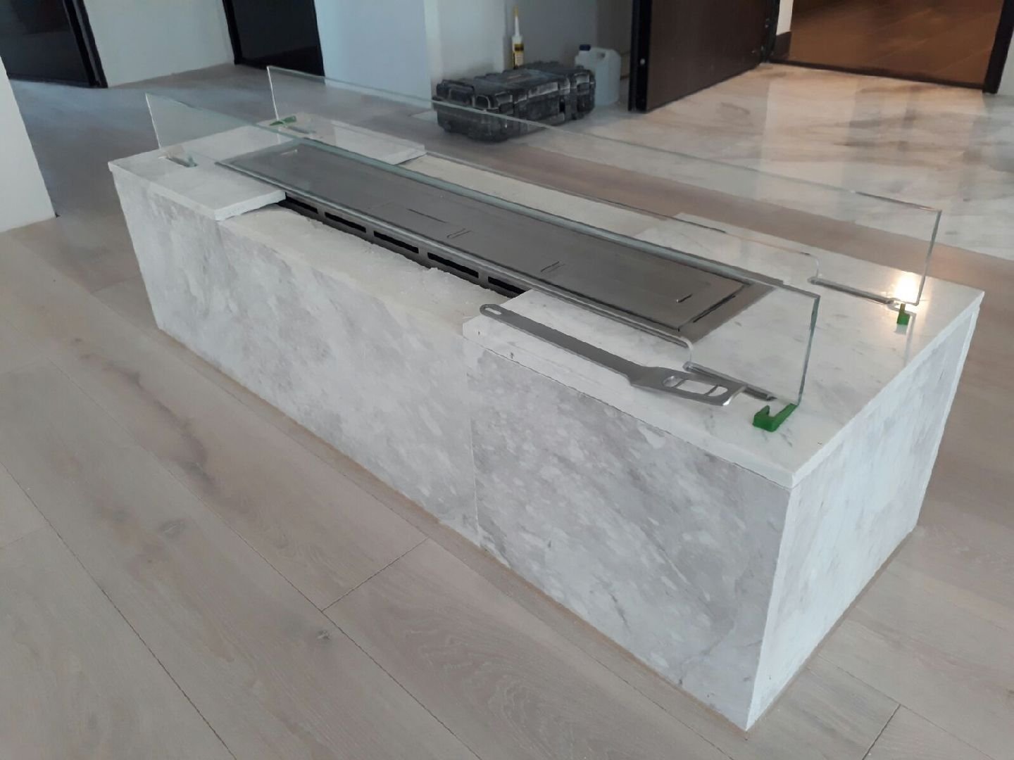 Zabudowa skrzyniowa zaprojektowany przez dział projektowy biopasja. Całość wykonana z aluminium gr 5 mm wraz z opuszczoną Top Płytą na dekorację paleniska - marmur biała Carrara. Palnik artflame 900 mm wraz z komorą bezpieczeństwa i manualną regulacją wysokości płomienia. Skrzynia kominkowa przed zabudowaniem.