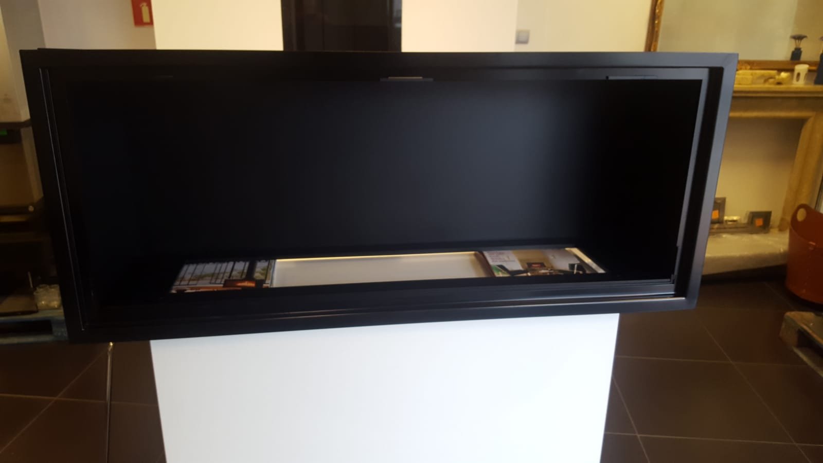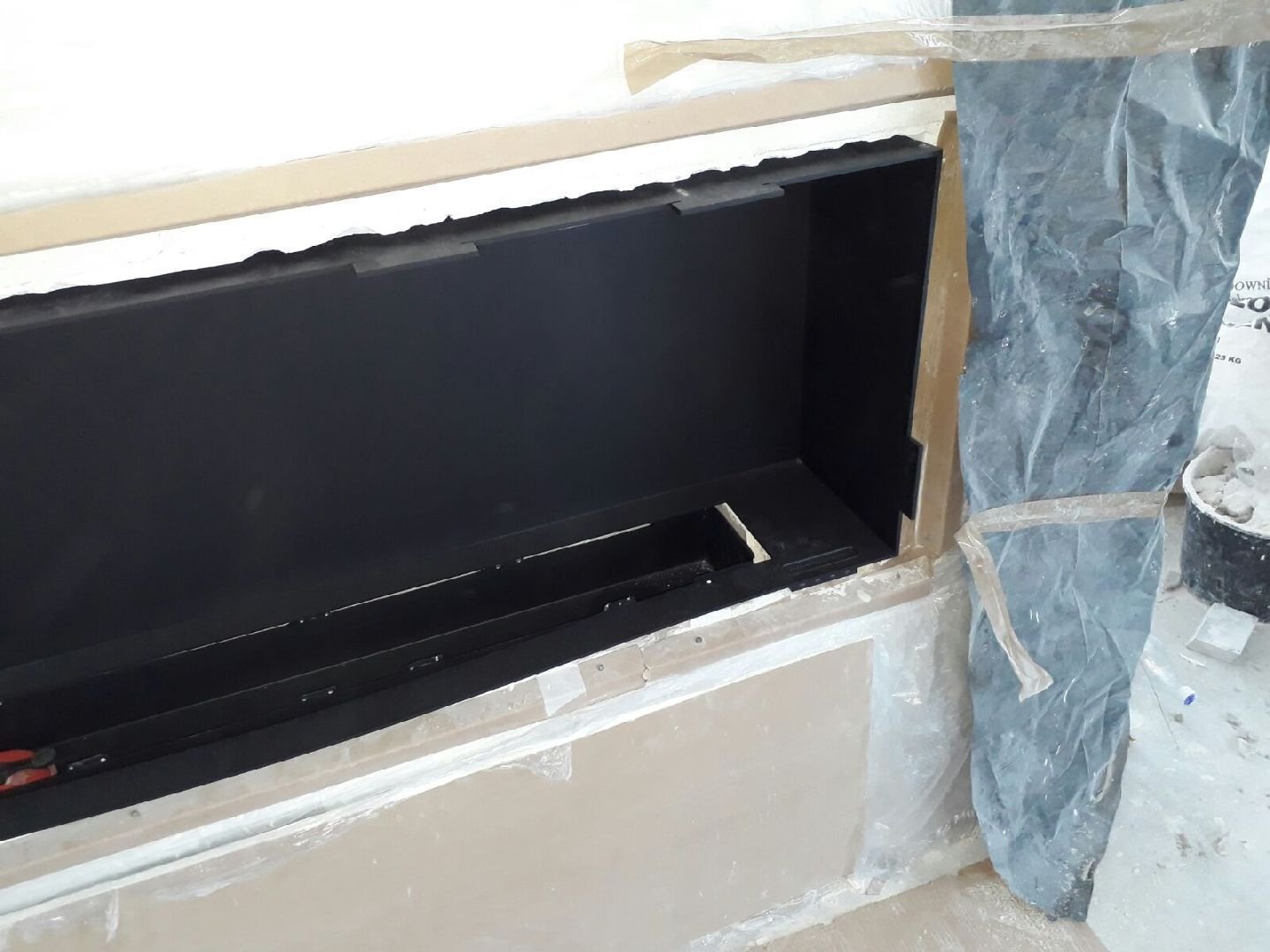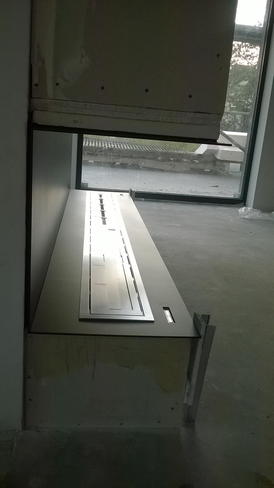 Zabudowa skrzyniowa zaprojektowany przez dział projektowy biopasja. Całość wykonana z aluminium gr 5 mm wraz z opuszczoną Top Płytą na dekorację paleniska - marmur biała Carrara. Palnik artflame 900 mm wraz z komorą bezpieczeństwa i manualną regulacją wysokości płomienia. Skrzynia kominkowa przed zabudowaniem.