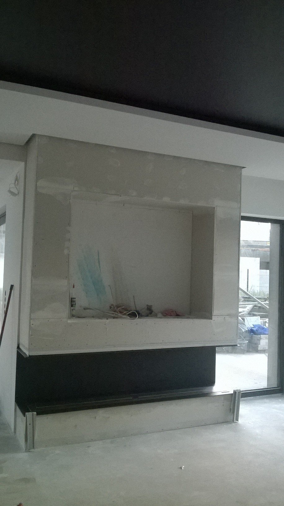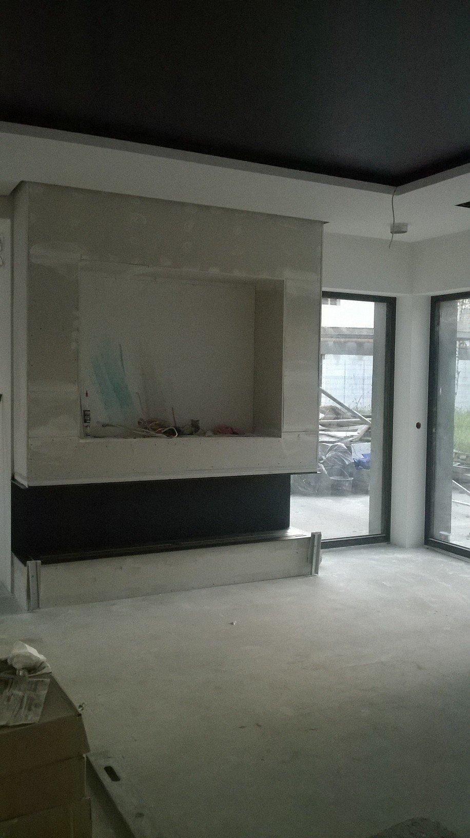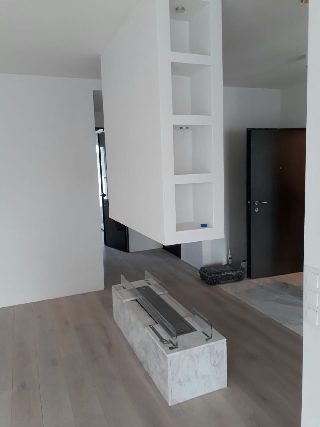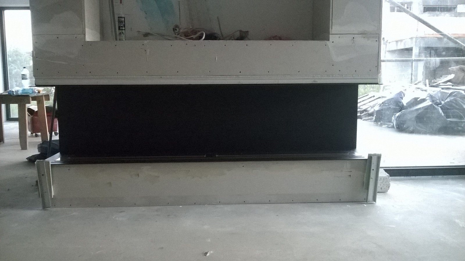 Zabudowa skrzyniowa zaprojektowany przez dział projektowy biopasja. Całość wykonana z aluminium gr 5 mm wraz z opuszczoną Top Płytą na dekorację paleniska - marmur biała Carrara. Palnik artflame 900 mm wraz z komorą bezpieczeństwa i manualną regulacją wysokości płomienia. Skrzynia kominkowa przed zabudowaniem.