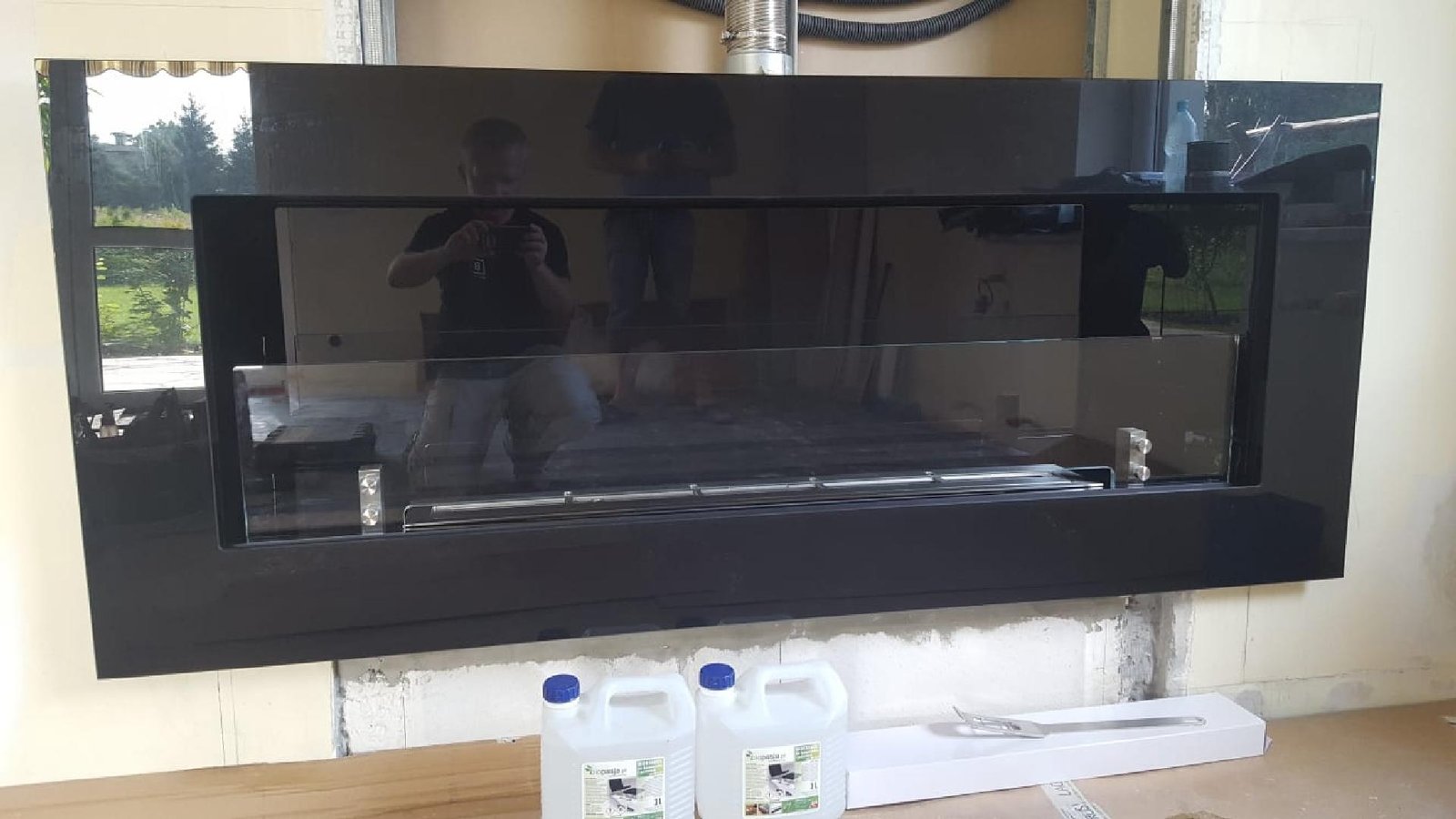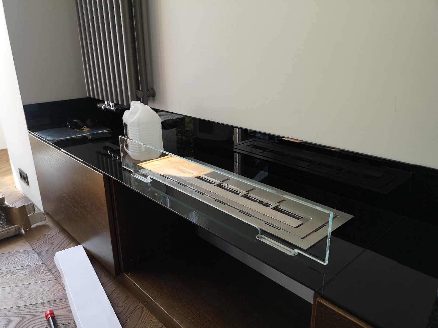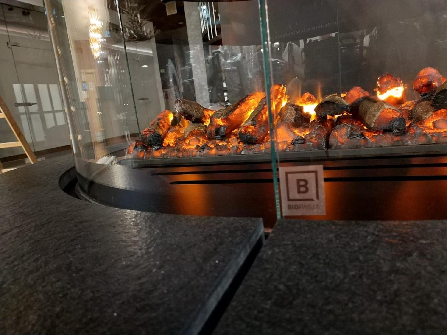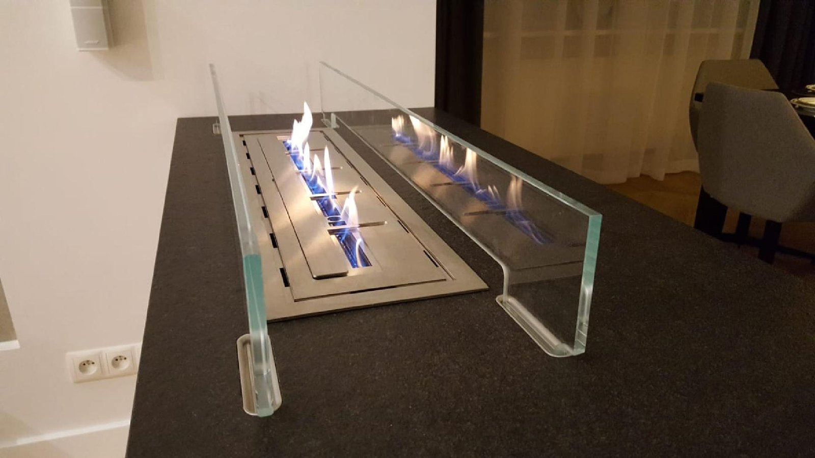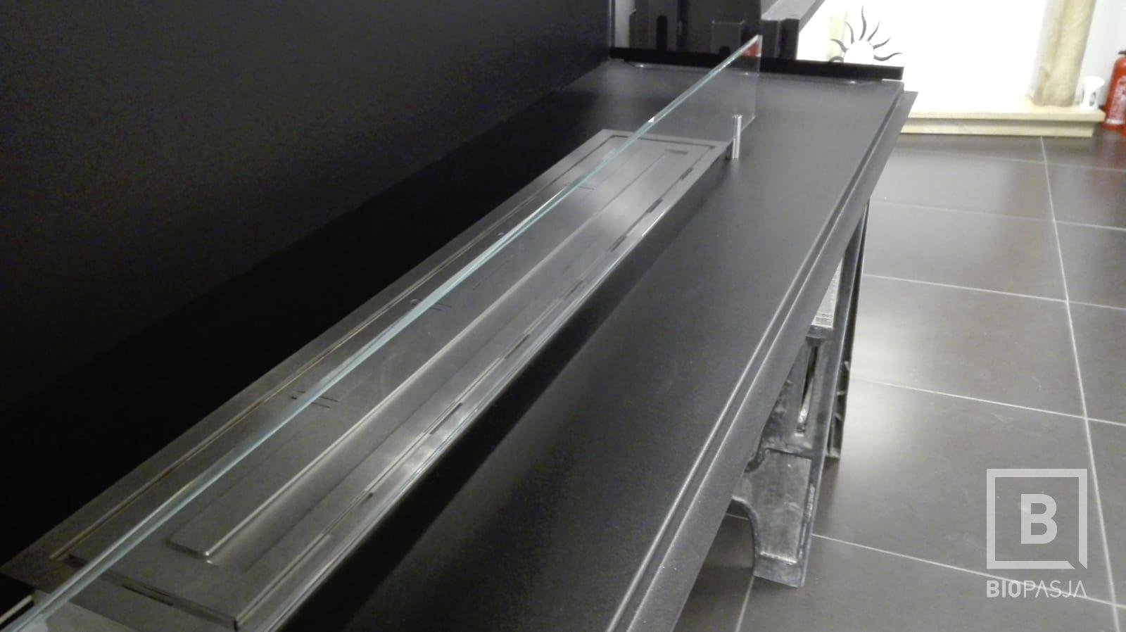 Indywidualny projekt, szklana konstrukcja 300kg wisząca z sufitu, podest pod konstrukcją szklaną, wykonany z granitu z opatentowanymi uchwytami concealed latches NEO PRO, palnik artflame 1200mm. Bardzo nietypowy i indywidualny projekt. Zapraszamy do współpracy. Zespół Biopasja -