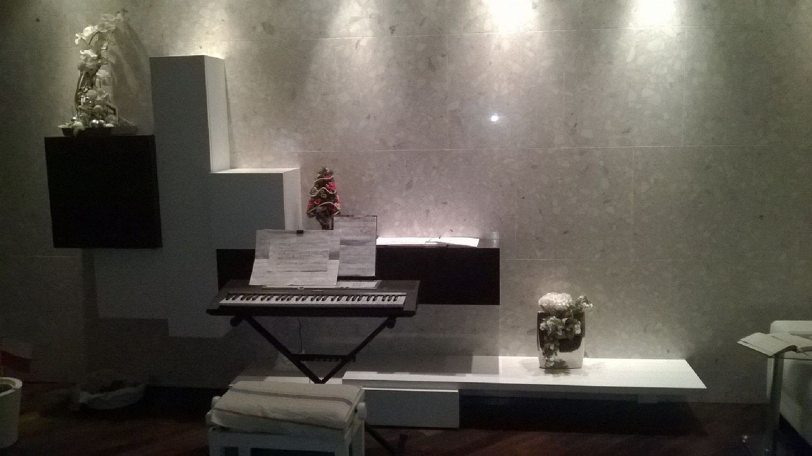 Stajnia dla konna, szklana konstrukcja o wadze 300 kg zwisająca z sufitu z granitowym podestem.