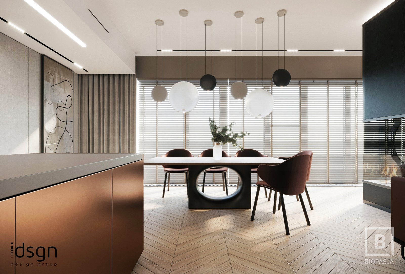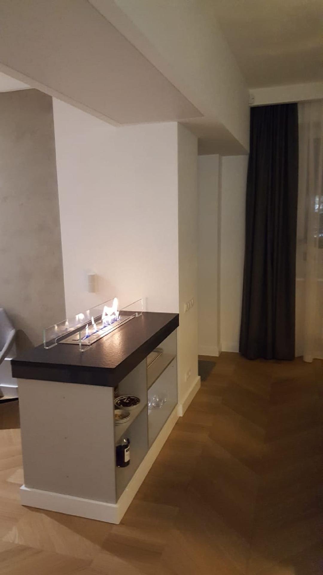 Zabudowa wykonana według projektu wykonanego przez zespół projektowy biopasja. Biokominek wykonany na indywidualne zamówienie wbudowany we wnękę z podwójnym paleniskiem