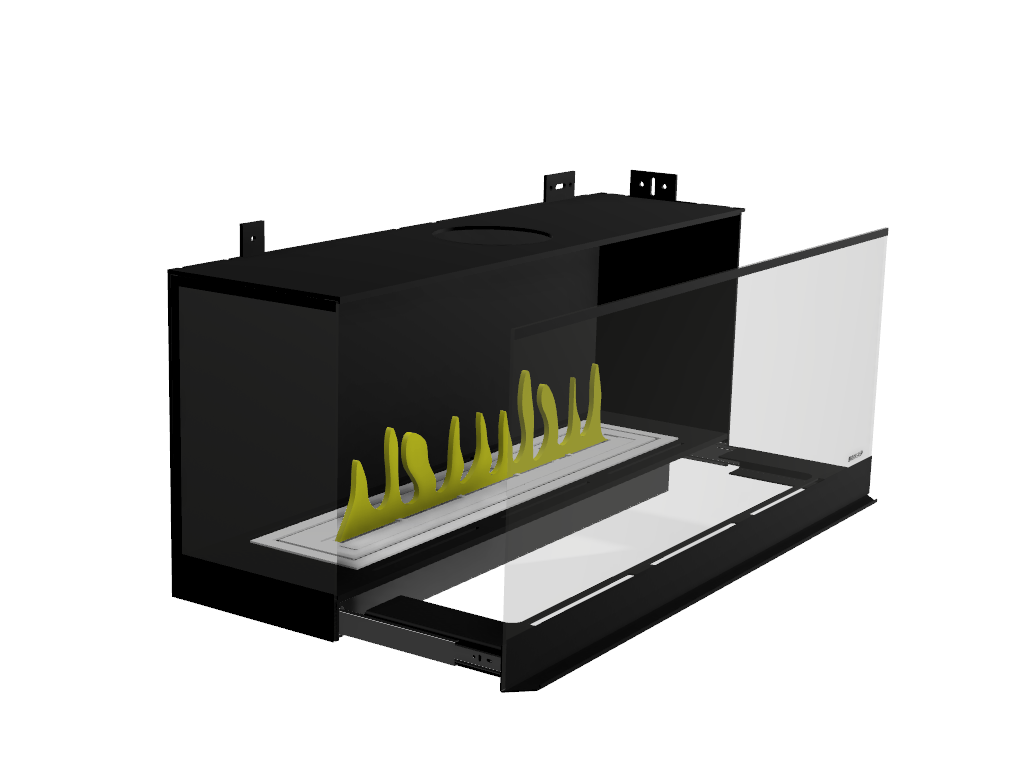 Biokominek wiszący o prostym i nowoczesnym wyglądzie. Główną zaletą urządzenia jest wentylowana tylna płyta oraz wymienna obudowa zewnętrzna, która posiada bardzo łatwy system demontażu umożliwiający jej wymianę na inny kolor. Konstrukcja urządzenia wykonana jest z aluminium gr 6 mm w kolorze czarny mat, w zestawie palnik ARTFLAME oraz hartowany ekran szklany Opti Withe gr 10 mm na wysokość 120 mm osadzony na uchwytach luźnych Easy. W opcji możliwa jest zmiana koloru zewnętrznej obudowy według palety ral Istnieje również możliwość zmiany uchwytów szyby oraz wymiarów. Dostępne jest również wyłożenie elementów pionowych czarnym szkłem -