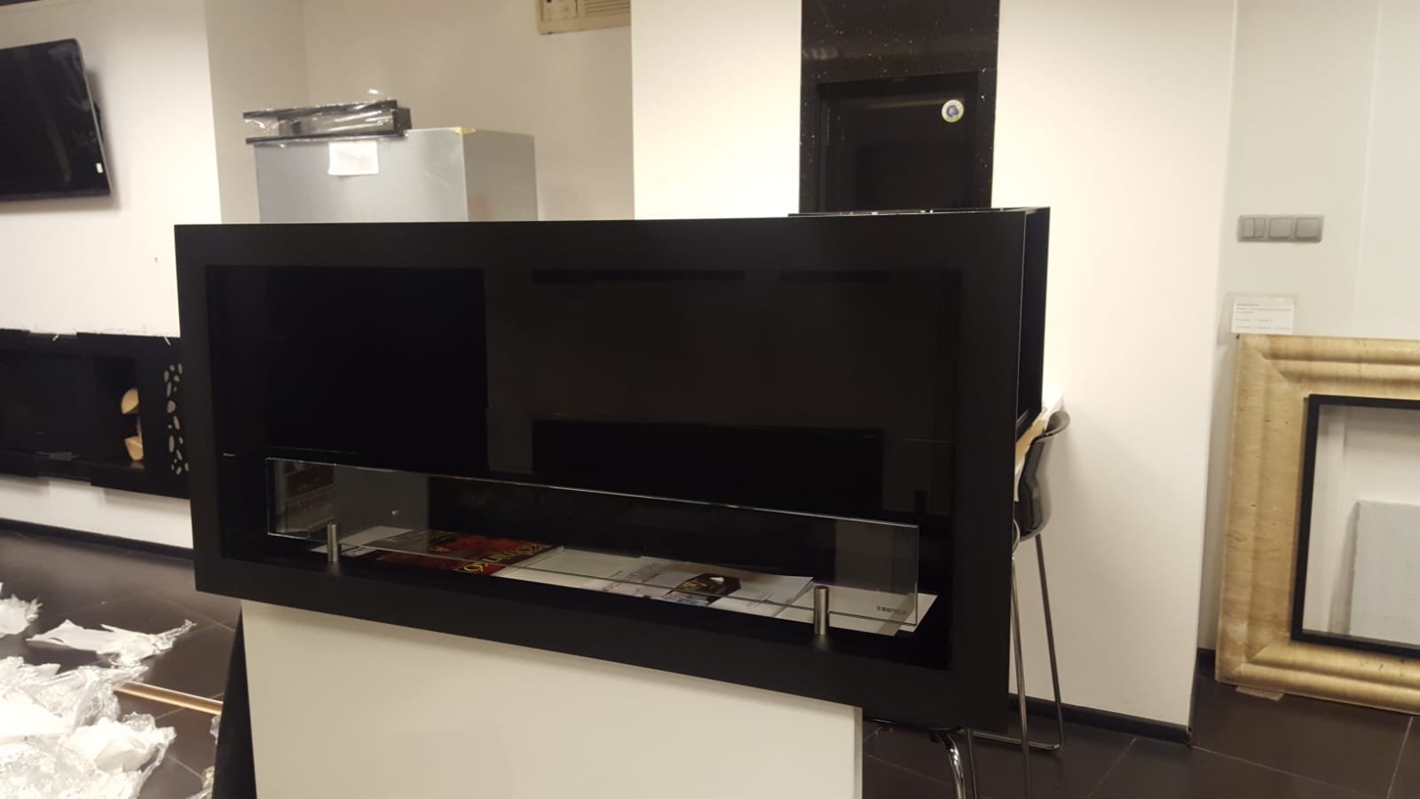 Biokominek wkład z lustrzaną ramą, ramka z systemem nieskomplikowanej lekkiej obsługi.