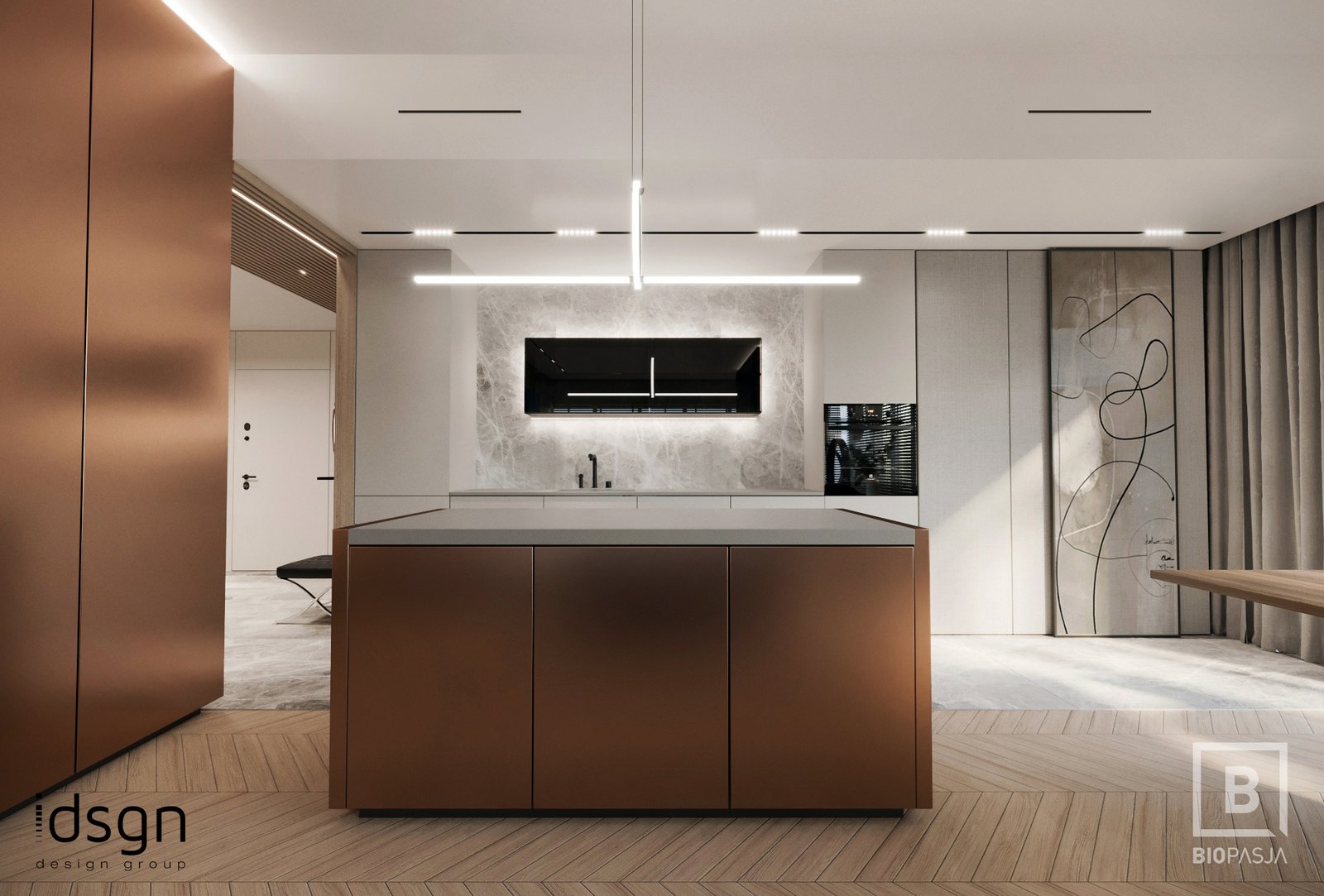 Biokominek według projektu wykonanego przez zespół projektowy biopasja. Wkład skrzyniowy wbudowany w ścianę wykonany z aluminium gr 5 mm oraz szybami OptiWithe gr 10 mm stabilizującymi płomień. Wkład obsługiwany z dwóch stron, za pomocą zawiasów stałych. Zabudowa obłożona kamieniem naturalnym Oriental Bazalt.